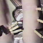 赤いブラウスの胸を切り裂き、乳房を露出しての洗濯バサミ玩弄。