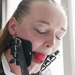 彼女はまず、8つのバックルを持つビショップギャグを口に装着します(セルフギャグ)。